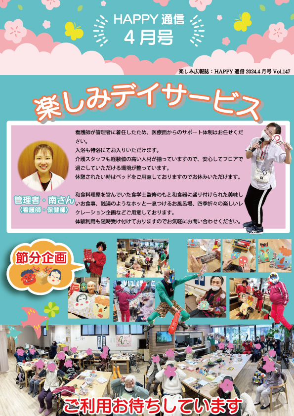 HAPPY通信は楽しみを利用してくださっている住吉区・住之江区・東住吉区のサービス事業所、病院、利用者様の元へ毎月お送りしております。是非お手に取って見ていただければ幸いです♪